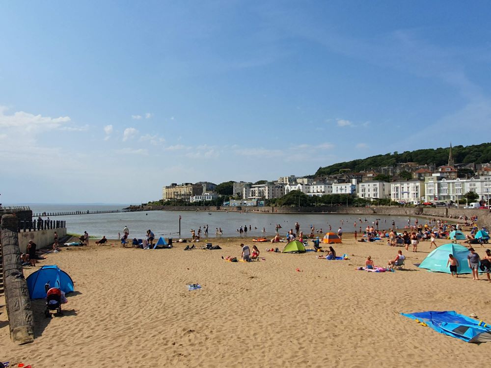 Weston’s bay faces onto the Bristol Channel, along the north coast of Somerset, with views extending across the water to Wales. The beach’s surface does consist of more mud than sand, and when the tide drops, eager children won’t be able to approach the water; danger signs warn holidaymakers of the risks of walking out over the mud. All is not lost, however. An artificial lake to the northern end of the main beach provides a place where children can splash about safely, and there is even a small and popular stretch of sand for a satisfactory beach experience. And around high tide, when the sea laps closer to the promenade, the wide exposed strip of sand is much more like a traditional beach.