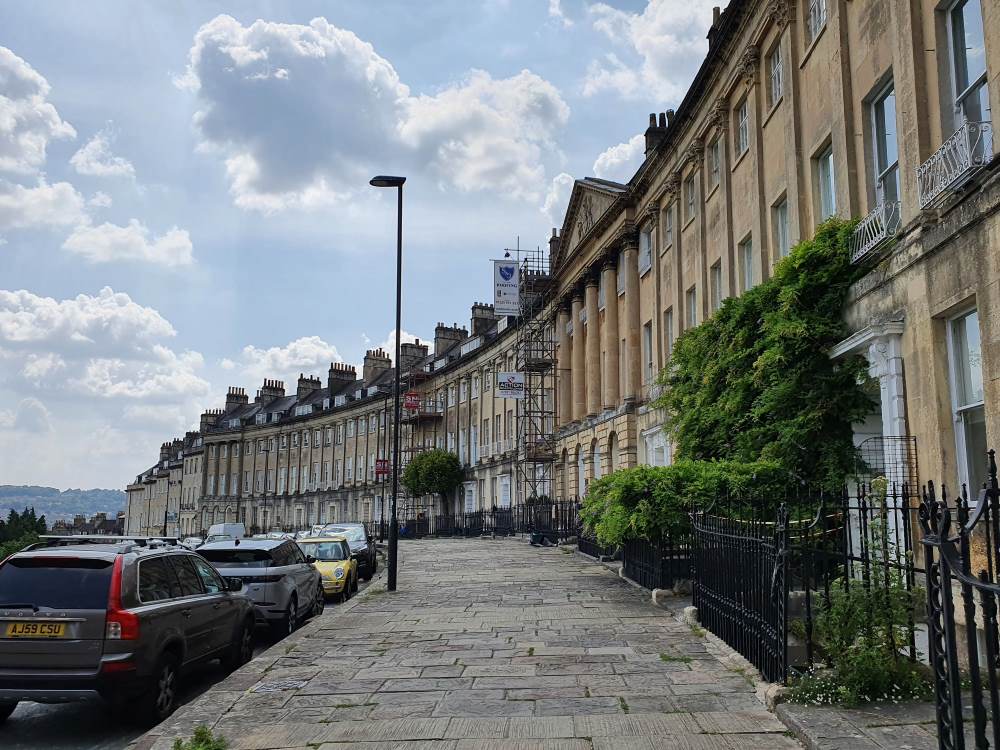 Gravel Walk opens out onto the green park lawns in front of the Royal Crescent. Turn right up to the Crescent to complete this walking tour. The Netflix movie set the Elliot’s house here on the Royal Crescent and also filmed an outdoor scene in front of No.1 Royal Crescent (I watched this being filmed – read about the filming of the Netflix Persuasion). No. 1 Royal Crescent, a backdrop to the Netflix filming, is a Georgian house museum, and you may find special Austen-themed exhibitions or tours.