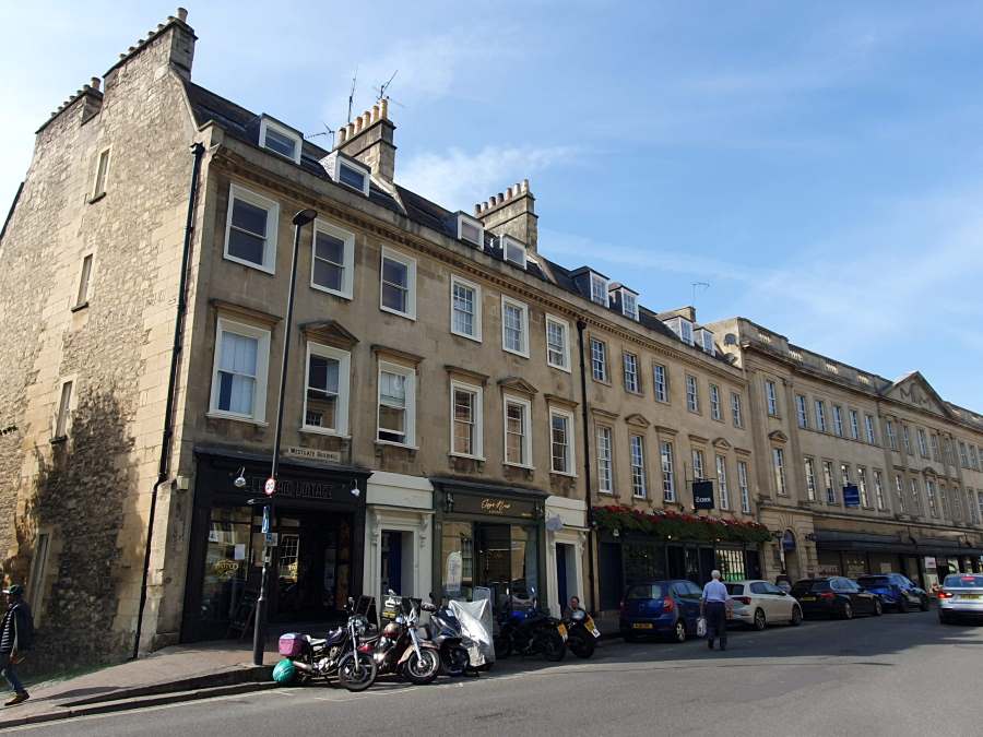 Look out for the Victorian post box on Laura Place (interesting, though later than Austen’s novel) and the historic facades of the Boater pub and the pharmacy at the corner of Argyle Street. This row dates to c. 1789, (albeit with later alterations), and so Anne and Austen would have passed the same buildings we see now. Number 9 (The Boater) was already the Argyle Tap, run by Bath Brewery Co. in 1809, before Persuasion takes place, and the pub’s bow front is also early 19th century.
